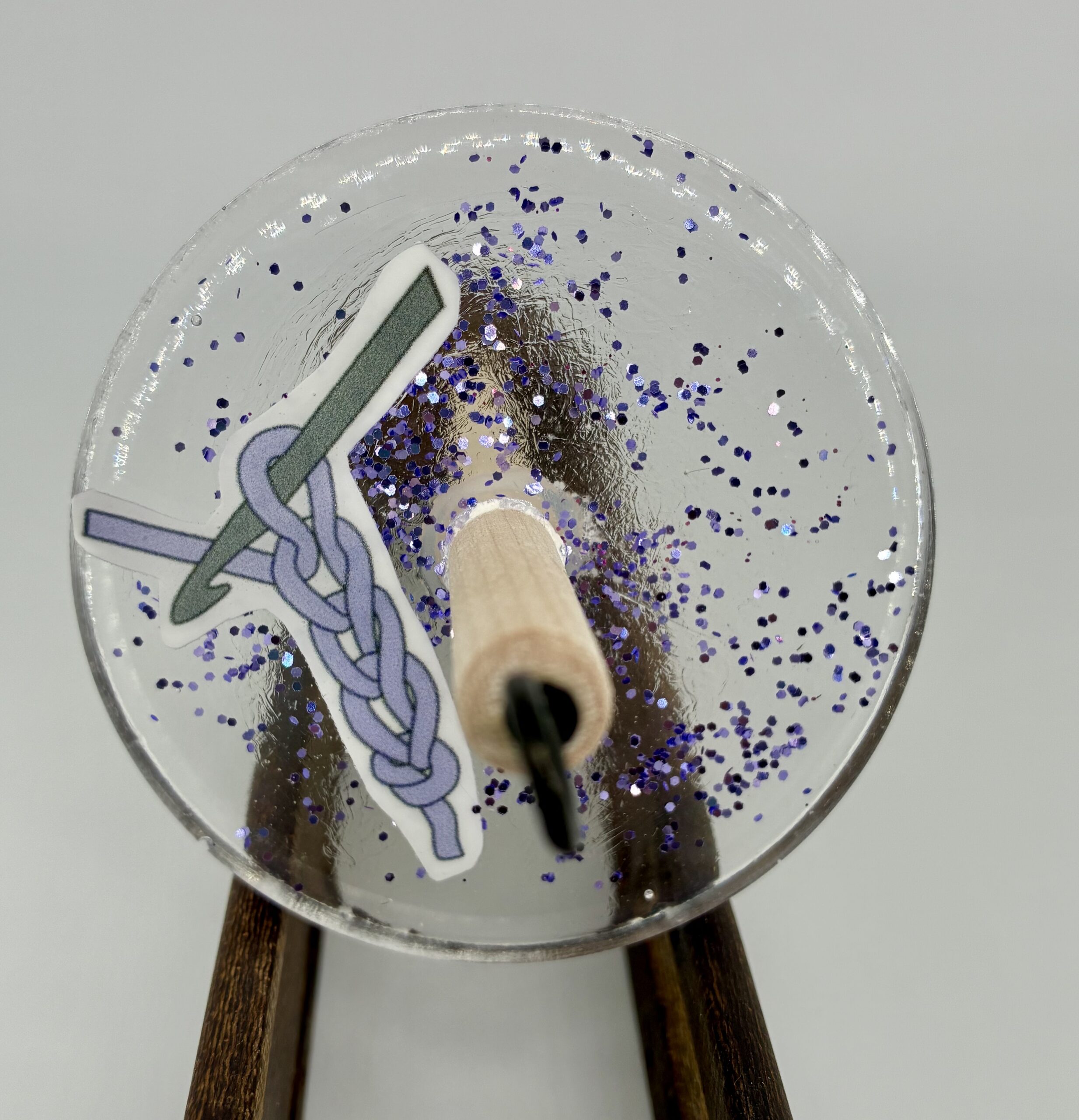 Heavy whorl perfect for spinning chunky yarns. Crochet hook with chain surrounded by purple glitter.
