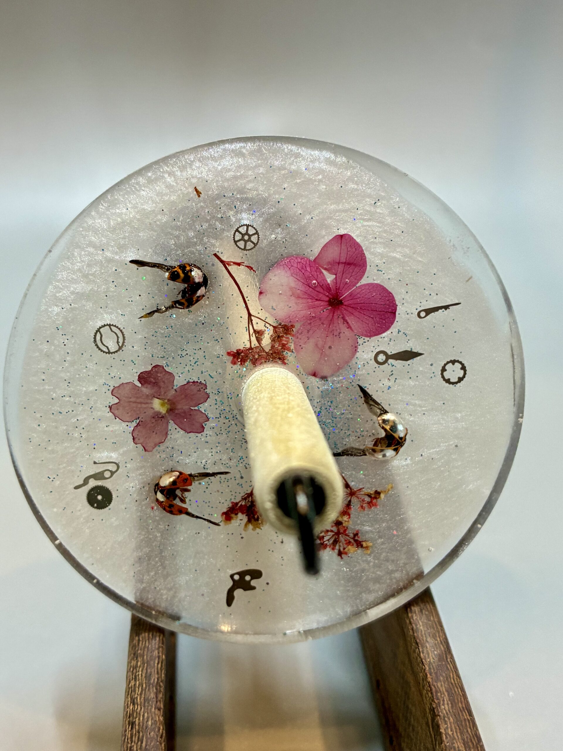 The most elegant pearl colored whorl with flying ladybugs and pressed flowers all locked in silver watch cogs.