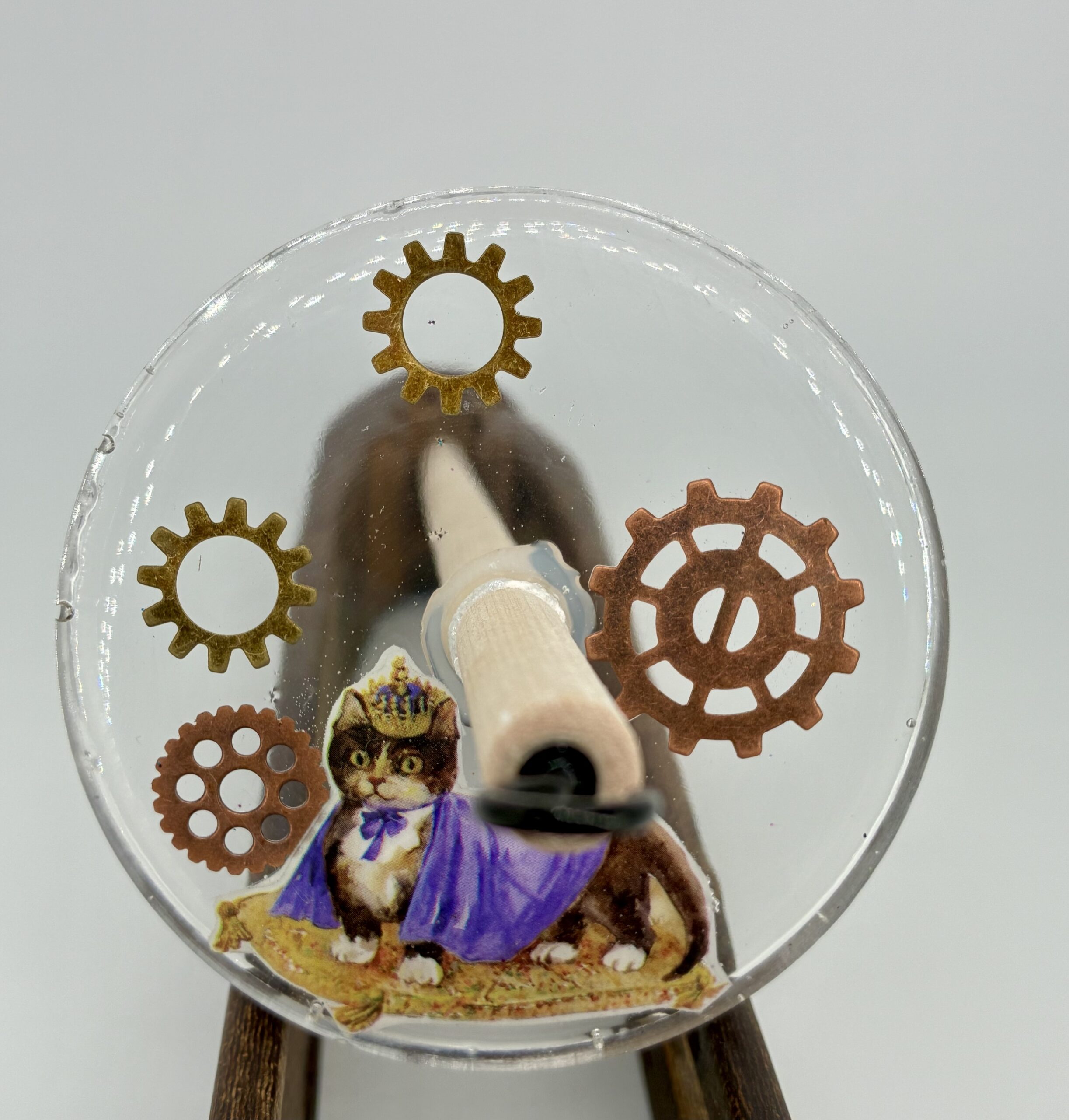 Heavy top whorl. Great for spinning chunky yarn and plying. Fancy cat with crown and cape upon a pillow surrounded by floating cogs.