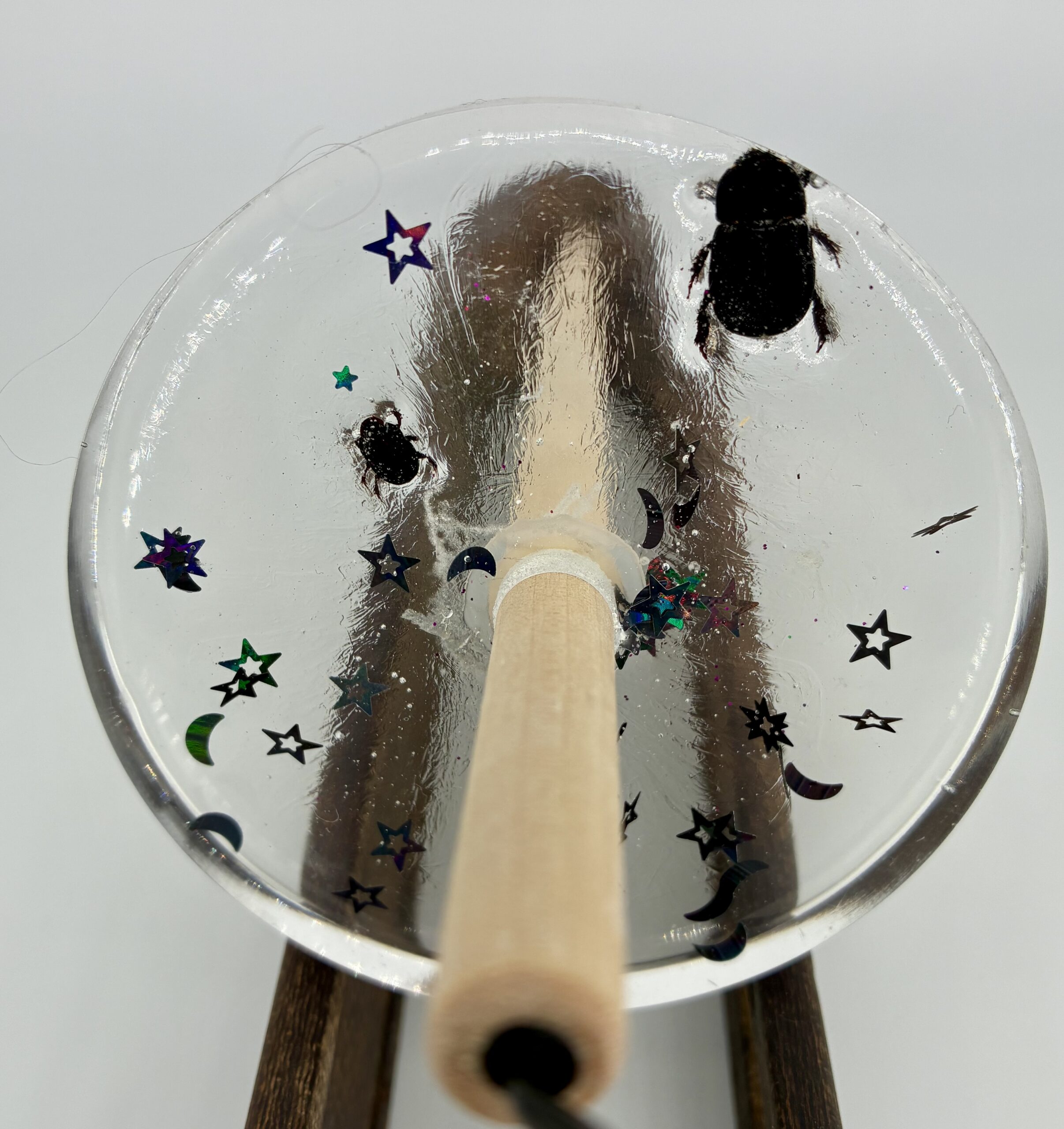 Heavy weight whorl great for spinning chunky yarn and plying. Beetle bodies crawling around moon and star confetti.