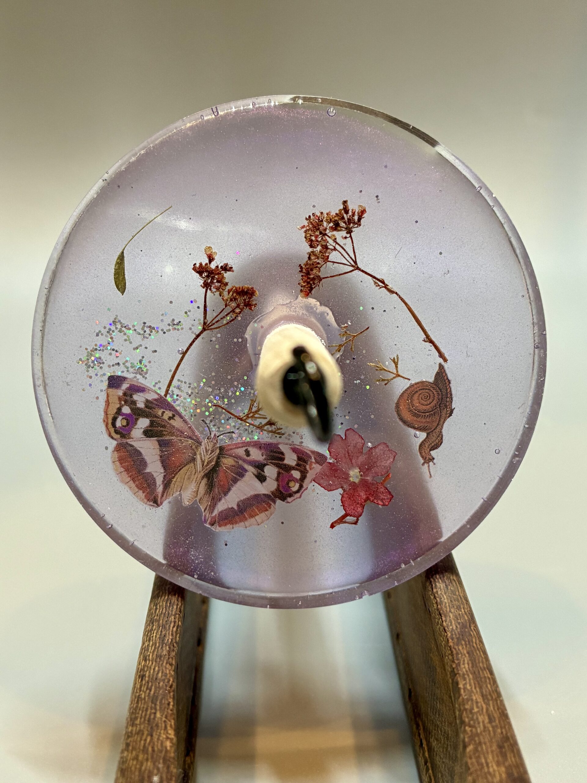 All about nature with this butterfly, snail, and pressed flowers surrounded by glitter with a purple backsplash.